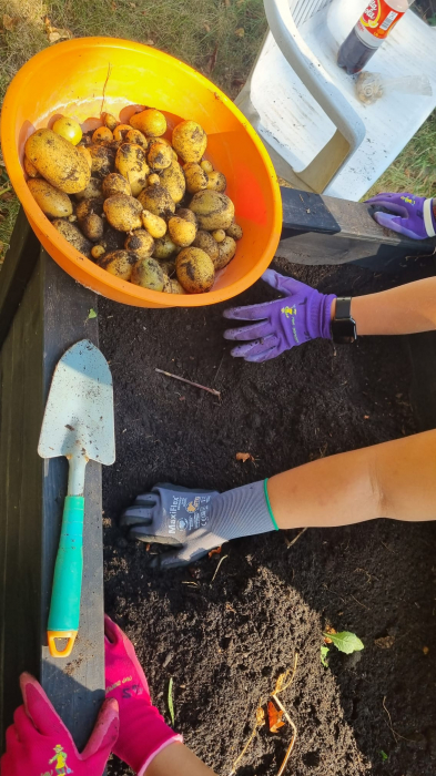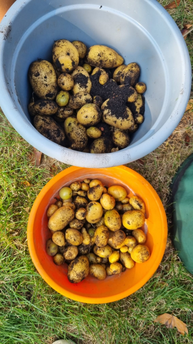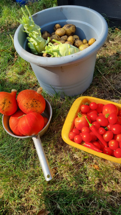 Anfang September war es endlich soweit. Wir konnten eine Menge Kartoffeln und auch schon 4 Hokkaidokürbisse ernten. Auch eine Menge Tomaten konnten wieder geerntet und in der Schule verteilt werden.