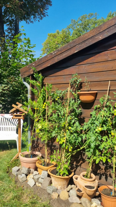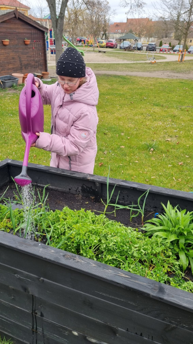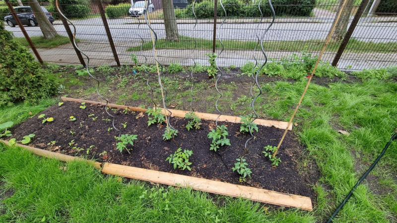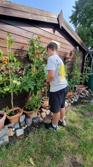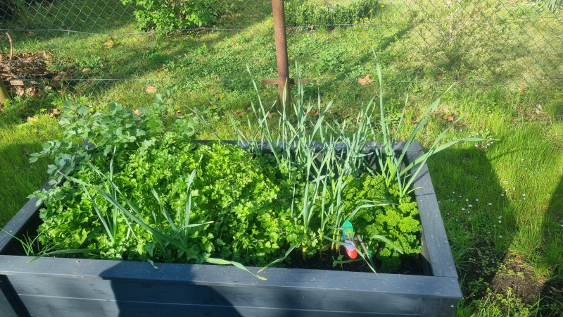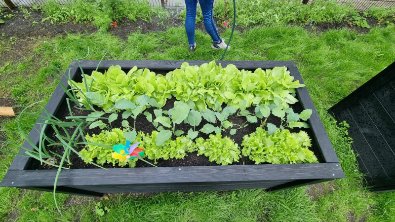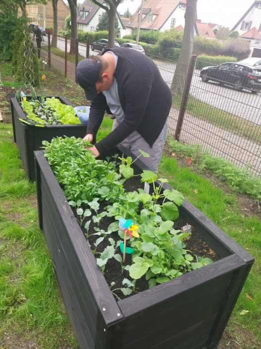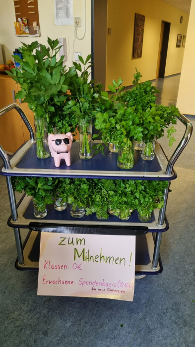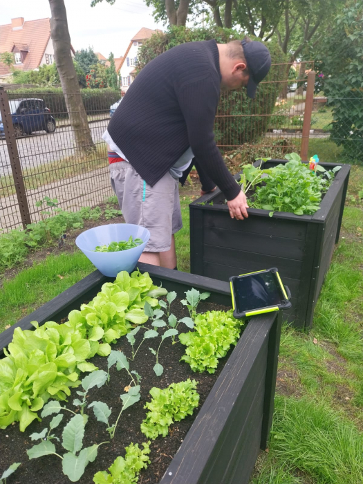 Fast täglich können Kohlrabi, Tomaten, Lauchzwiebeln und Kräuter wie Petersilie und Schnittlauch geerntet werden. Auch die Kaninchen unserer Schülerinnen und Schüler können sich freuen. Die Blätter des Kohlrabis schmecken ihnen besonders gut.