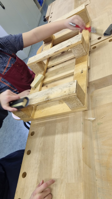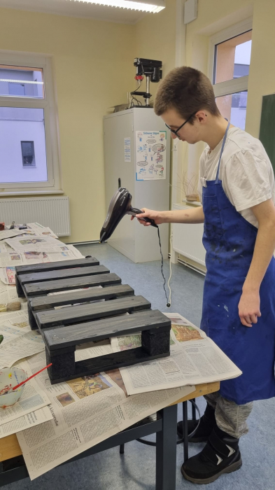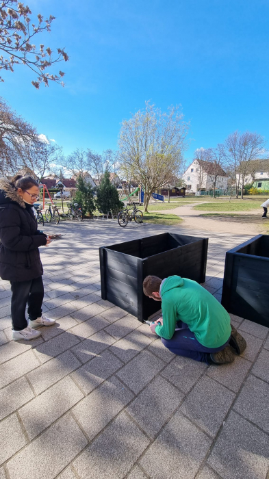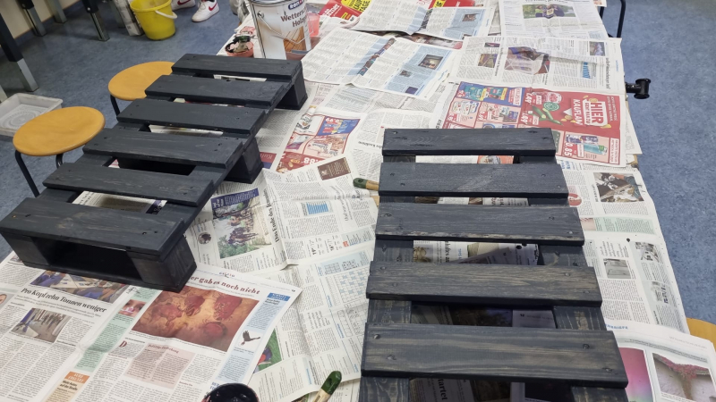 Bei uns wird nichts weggeschmissen. Aus alten Paletten werden bald kleine Kräuter- und Blumenbeete. Auch bei Regenwetter kümmert sich die Schulgarten- AG um neue Dinge für unseren Sonnengarten. Die Schülerinnen und Schüler haben zuerst fleißig und sorgfältig die Paletten geschliffen, bevor sie zwei Schichten wetterfesten Lack aufgetragen haben. So passen sie perfekt zu unseren Hochbeeten.