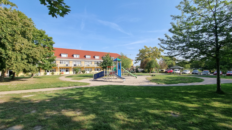 Hier sehen Sie unsere Schule mit dem angrenzenden Spielplatz.